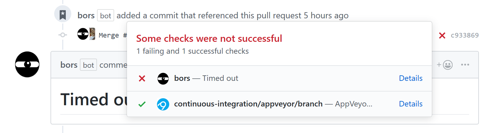 Based on the information as I processed it, all CI checks that Bors is configured to be listening to did report a success before Bors reported a timeout. CI passes in less than 10 minutes on both Travis and AppVeyor.